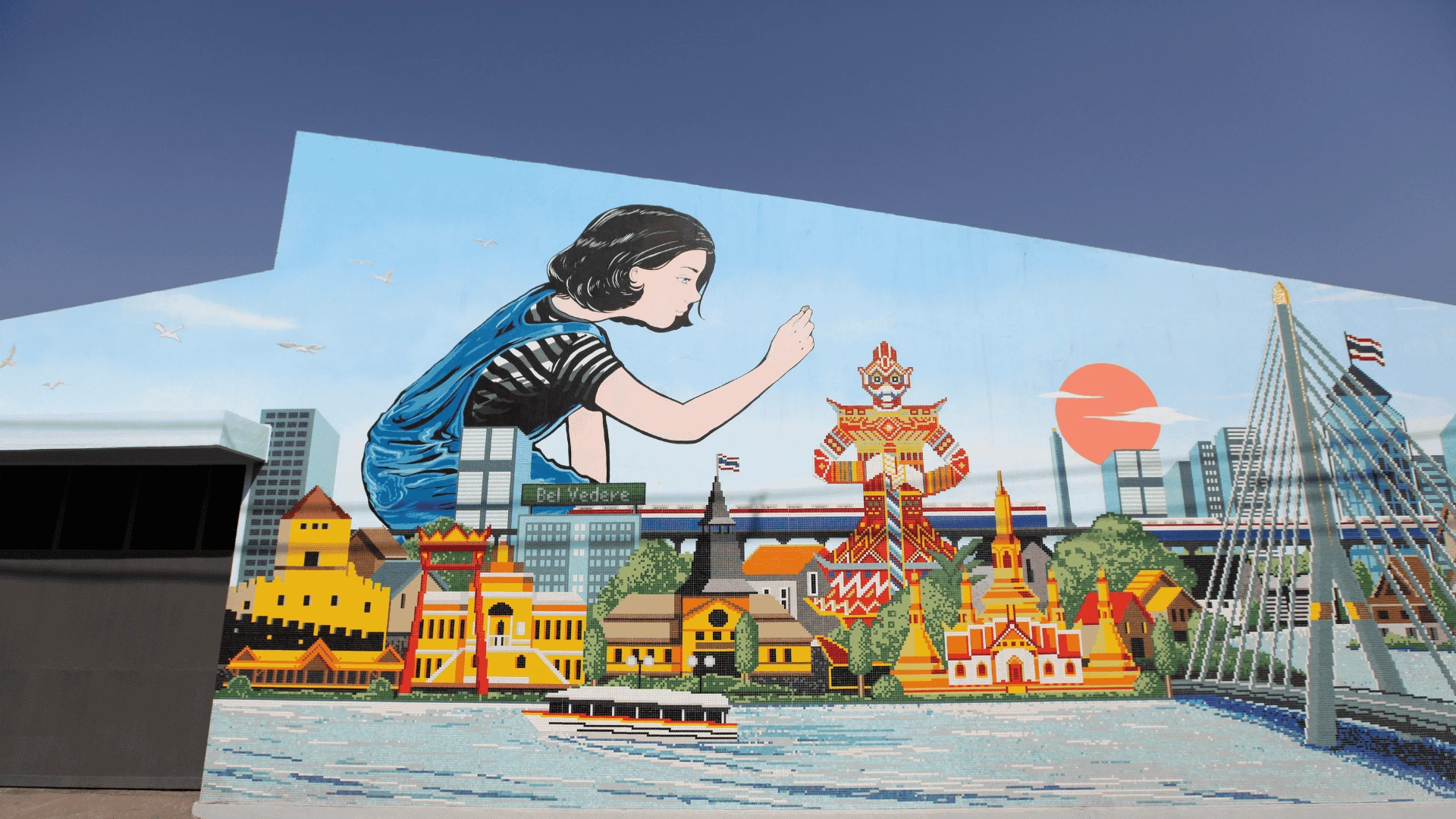 โครงการ: ผนังศิลปะ Bel Vedere (Bel Vedere Warehouse Landmark) วัสดุหลัก: Mosaic & Mural Painting Fusion (งานโมเสกแก้วผสมผสานงานจิตรกรรม) แรงบันดาลใจ: ทัศนียภาพและจิตวิญญาณของกรุงเทพมหานคร