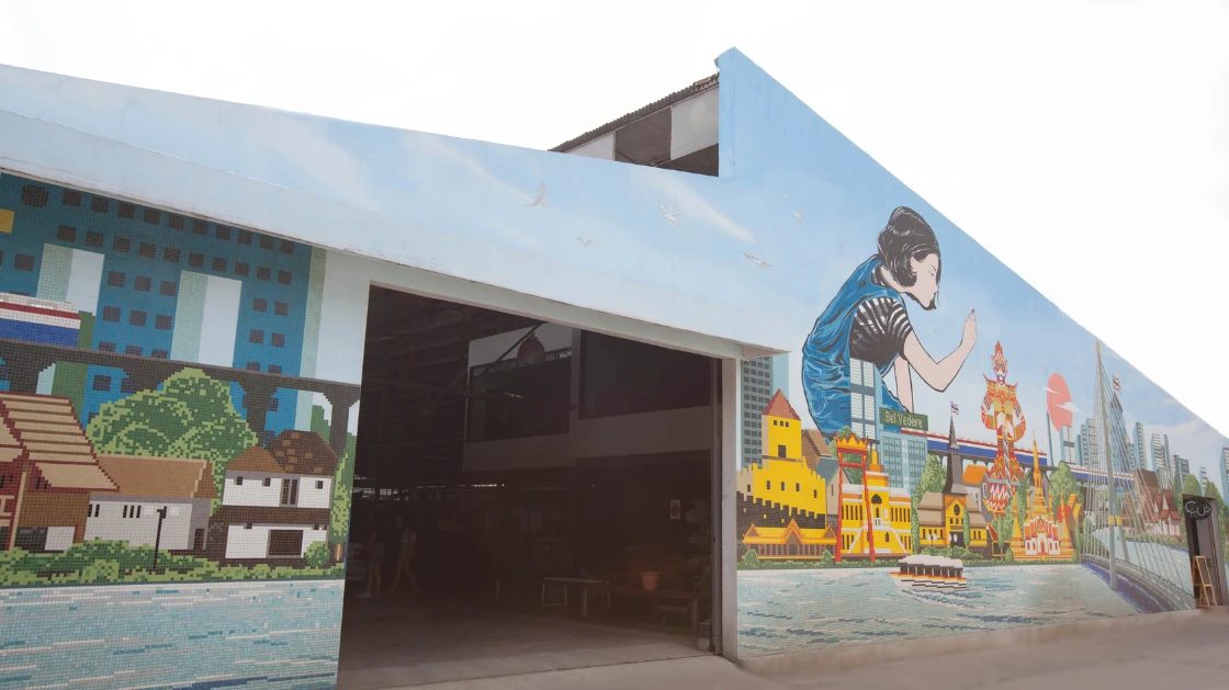 ภาษาไทย: Bel Vedere Wall คือผลงานชิ้นเอกที่ตั้งอยู่ ณ หัวใจของโกดังสินค้าของเรา ซึ่งไม่ได้ทำหน้าที่เป็นเพียงผนังอาคาร แต่คือ "ผืนผ้าใบ" ที่บอกเล่าเรื่องราวความผูกพันระหว่างแบรนด์กับกรุงเทพมหานคร ผลงานชิ้นนี้คือการก้าวข้ามขีดจำกัดของวัสดุด้วยการผสมผสาน งานโมเสกแก้ว (Mosaic) เข้ากับ งานจิตรกรรม (Painting) อย่างไร้รอยต่อ