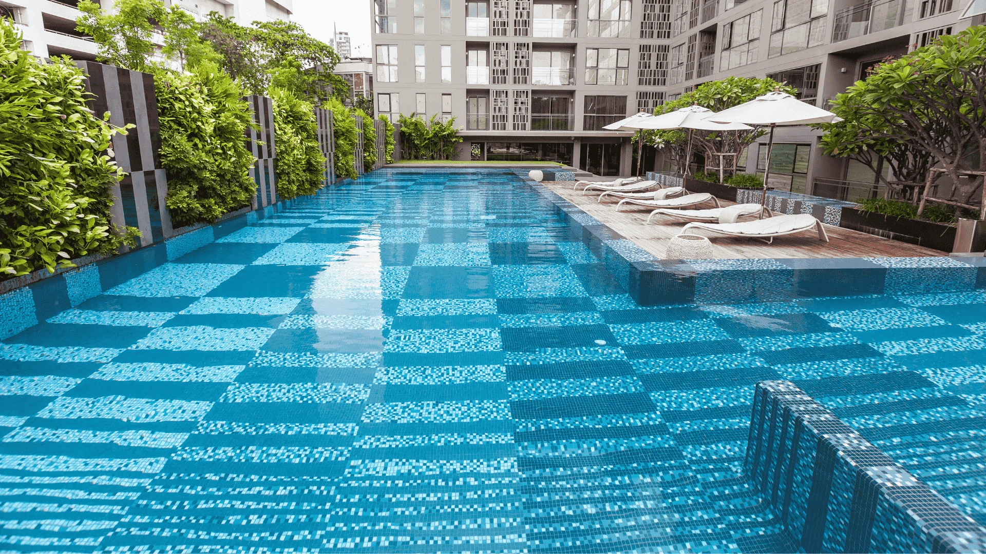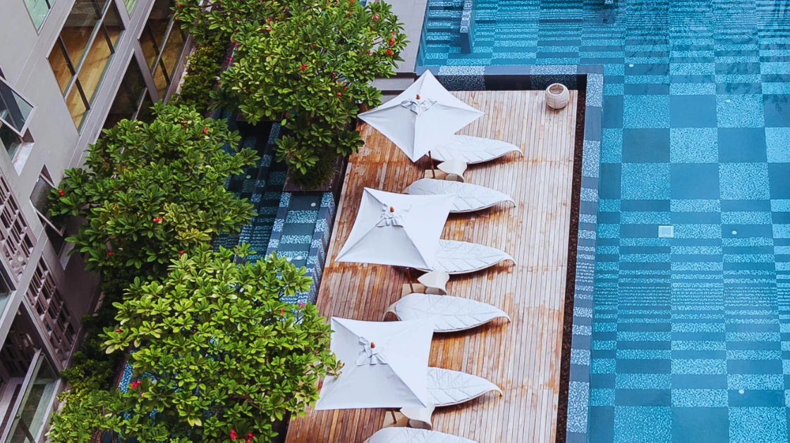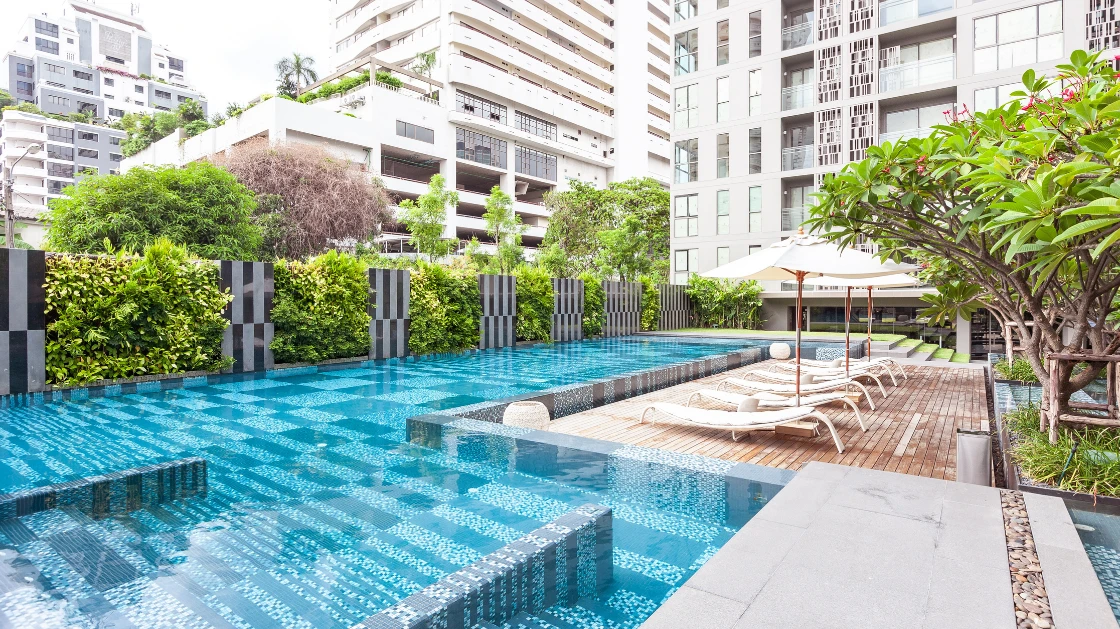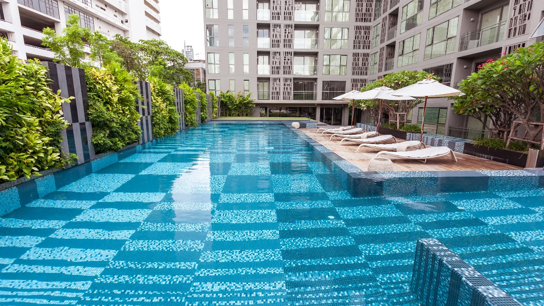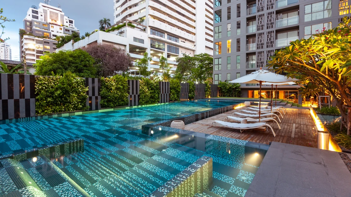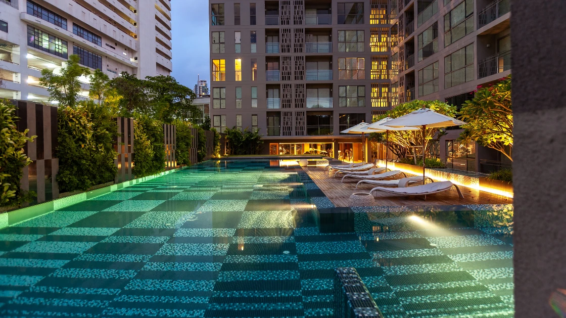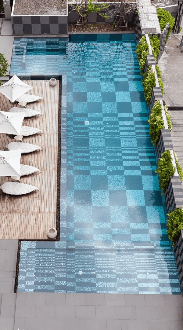 ความโดดเด่นอยู่ที่การใช้โมเสกในการสร้างลวดลายเชิงเส้นและรูปทรง (Geometric & Organic Patterns) ที่มีความละเอียดสูง โดยการคำนวณจังหวะการวางเม็ดโมเสกอย่างแม่นยำ เพื่อให้เกิดความต่อเนื่องลื่นไหลไปตามโครงสร้างสถาปัตยกรรม ไม่ว่าจะเป็นบริเวณสระว่ายน้ำหรือพื้นที่ส่วนกลาง การไล่เฉดสีในแพทเทิร์นถูกออกแบบมาเพื่อสร้างมิติ "แสงและเงา" ที่ดูเป็นธรรมชาติ สอดรับกับแนวคิด Botanical ที่เป็นหัวใจหลักของโครงการ ทำให้วัสดุโมเสกไม่ได้เป็นเพียงแค่การปูพื้นผิว แต่เป็นงานศิลปะที่ถักร้อยเรื่องราวความหรูหราให้เข้ากับธรรมชาติอย่างลงตัว